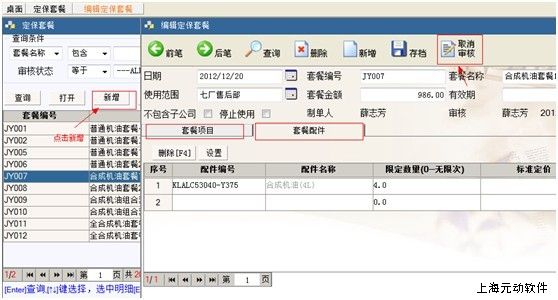 点击新增,录入:套餐编号,套餐名称,使用范围,套餐金额,有效期,套餐项目及套餐配件。点击审核存档生效。