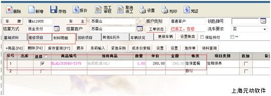 此时,材料明细或者维修项目中,就会载入定保套餐里的内容,并且账类是:定保套餐