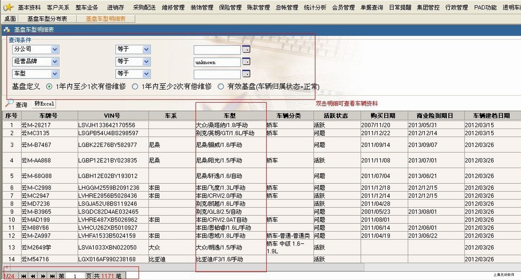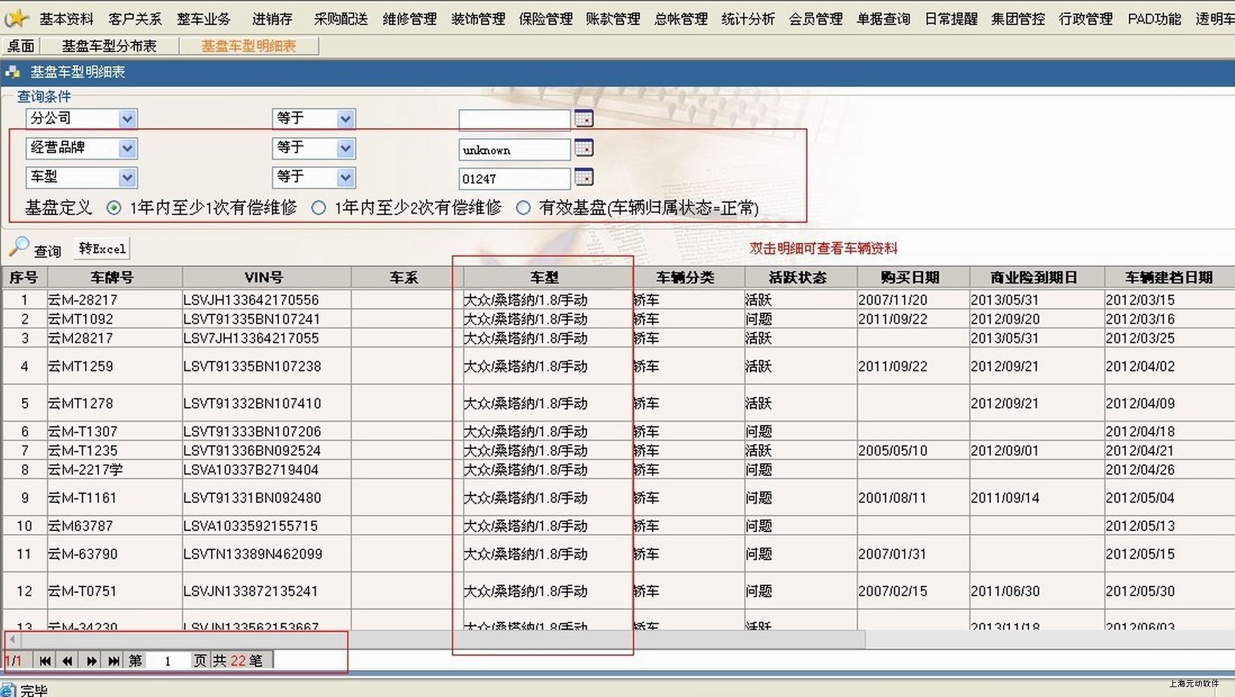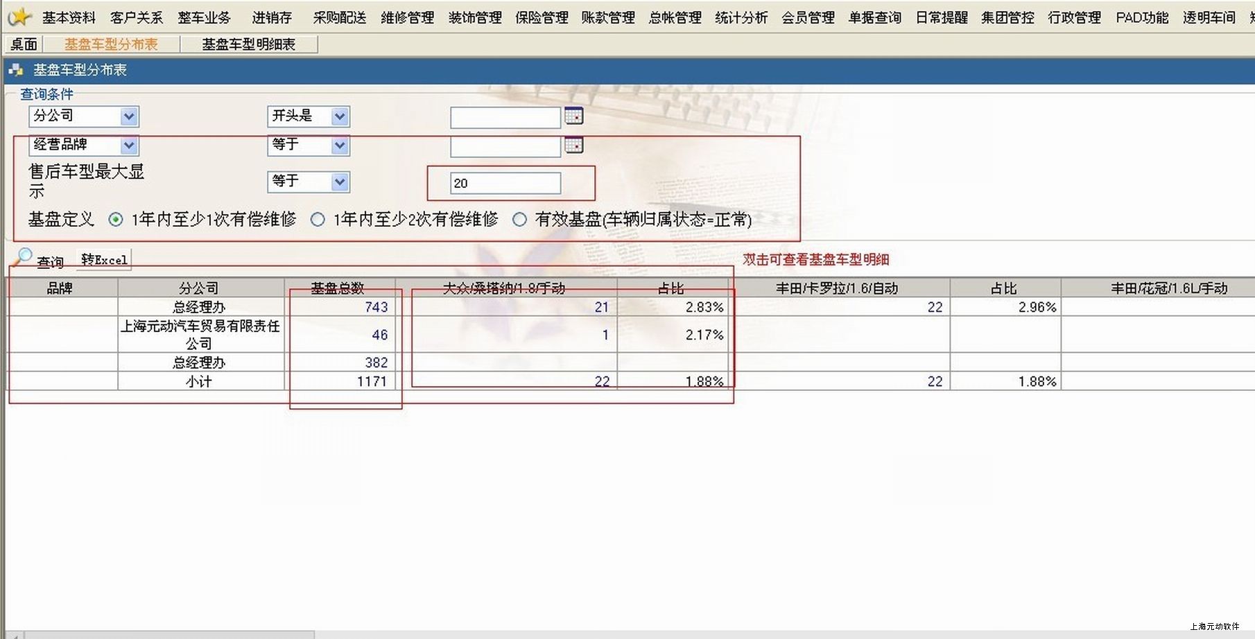 2.双击可进入基盘车型明细表,根据车型筛选有系统内有效客户资料