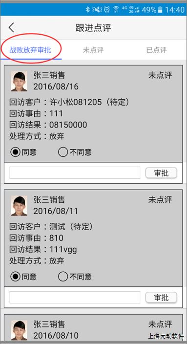 以下为战败放弃审批界面,战败客户需销售经理审批后方可进行战败处理;