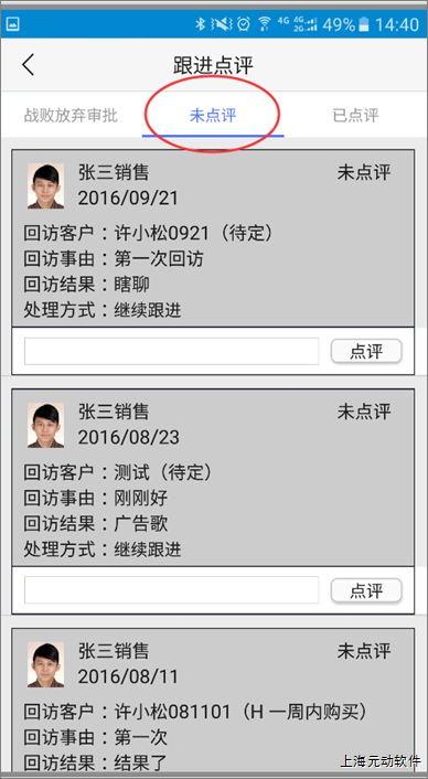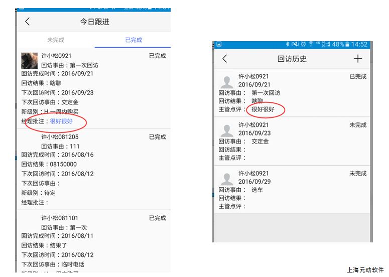 4、销售顾问能够在今日跟进和回访历史中看到跟进点评内容