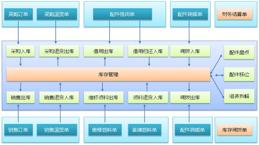 提供了库存查询、库存盘点、配件库内转移、配件组装与拆解等仓库内部管理功能支持,方便了进行库内日常业务的操作。另外为了满足日常维修需要,保证服务的质量,可以对仓库设置安全库存、预警库存等,即可保证维修服务时不缺料,又可有效的控制库存成本。