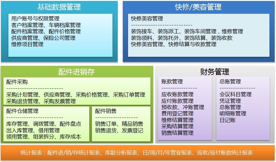 系统覆盖了基础数据管理、维修管理、美容装饰管理、配件进销存管理、财务账款管理和统计分析报表等,功能简洁完整,不缺乏先进的管理理念与应用。